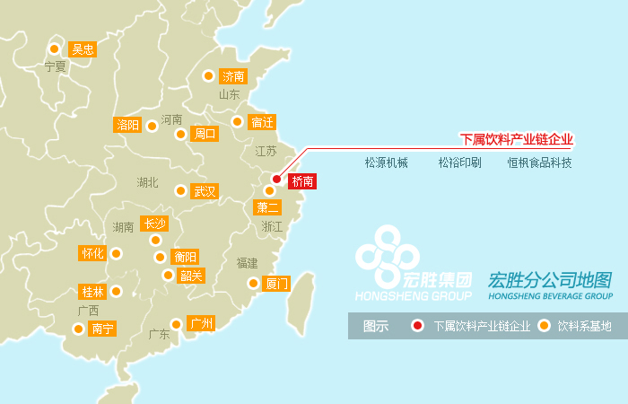 宏勝集團擁有20多年的生產(chǎn)經(jīng)驗,以及全球領先的自動化生產(chǎn)線,參與國際競爭,承接各類飲料OEM業(yè)務。共有飲料系企業(yè)36家,分布杭州、長沙、武漢、濟南、廣州等16個基地。 生產(chǎn)基地:布局全國,產(chǎn)地直銷 組建六大區(qū)域,整合區(qū)域內的生產(chǎn)、物流、人員、銷售,提高市場反應靈活性。遍布全國的生產(chǎn)基地、實現(xiàn)500公里半徑市場覆蓋。