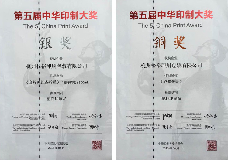 由中國印刷及設備器材工業協會主辦的第五屆中華印制大獎已完美落幕,中華印制大獎賽立足于中華地區的印刷行業,由大陸、香港、臺灣、澳門四個地區的印刷協會共同舉辦,獎項涵蓋各類印刷產品、杰出企業家等,是行業內唯一經國家批準的保留評比項目,華人印刷界最高印刷獎項。松裕公司報名了本次大獎賽并前往廣東參加了頒獎典禮,本次大賽形式新穎、大獎紛呈,最終評選出金獎20個,銀獎53個,銅獎85個以及優秀獎91個。松裕作為凹印界的一顆新星,與協會保持密切溝通,及時抓住機會,經個人申報、單位推薦、專家評審等程序,松裕公司報送的“套標冰紅茶檸檬(麥仔茶瓶)”獲得塑料印刷品類銀獎,“谷物傳奇”獲得塑料印刷品類銅獎,共計兩個大獎。